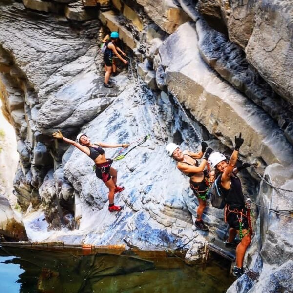 La vía ferrata comienza con un primer tramo vertical por el que ascenderemos hasta las crestas superiores que coronan nuestro itinerario. Desde allí continuaremos progresando por escalones y pasamanos horizontales sobre las altas paredes de piedra caliza que se precipitan hasta el fondo del embalse, cruzaremos dos espectaculares puentes colgantes de 5m y 15m y llegaremos a la vertiginosa tirolina de más de 30m. Para finalizar nuestra ruta cruzaremos un último y emocionante puente de mono de casi 20m.